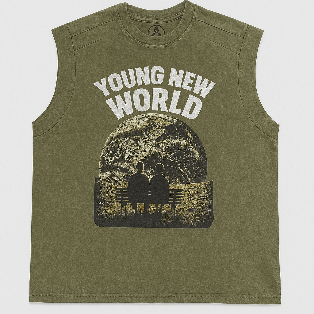 Embrace the bold, limitless spirit of the Young New World with the YNW Freedom Cut. This vintage olive-green sleeveless tee is a statement of freedom, power, and vision. The graphic features a captivating scene of two figures sitting on a bench, gazing at Earth from a distant perspective a metaphor for dreaming beyond limits.